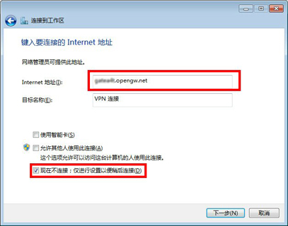 在你粘贴 "Internet 地址" 之后,选择屏幕下方的复选框 "现在不连接;
